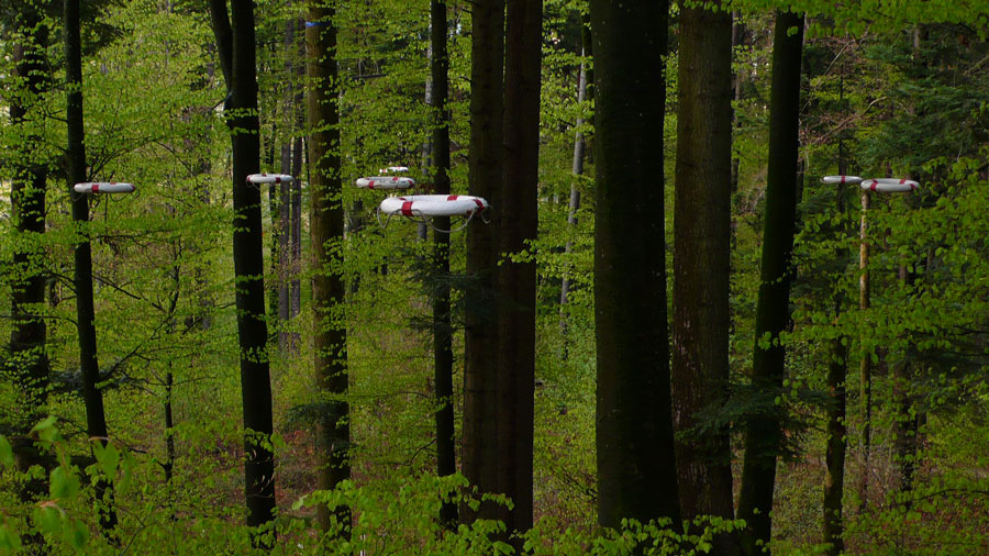 Huit bouées de sauvetage suspendues définissent un plan horizontal