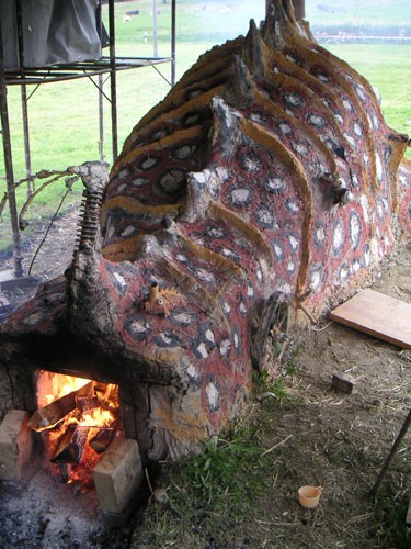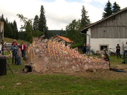 Le four monumental constitue la pièce centrale des festivités marquant les vingt ans de la Galerie d’Eric Rihs ceramiste aux Emibois. On dépouillera d’abord le four de sa croûte protectrice pour en extraire ensuite les modules, après quoi il ne subsistera que les cendres de cuisson.