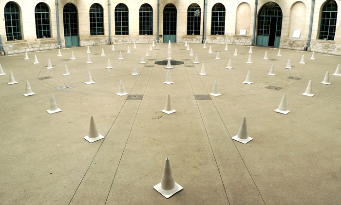 Le projet initié en 2009 fait référence à Lübeck, ville où Ewald Kongsbak a développé, dès 1952, les premiers cônes de chantier, ou cônes de Lübeck, dont les bandes blanches et orange nous sont bien connues. L’installation, en dialogue avec l’architecture circulaire de la Halle au Blé nous invite à déambuler sous la coupole vitrée réalisée en 1865 par l’architecte Charles Arnoul et l’ingénieur Charles Croquefer