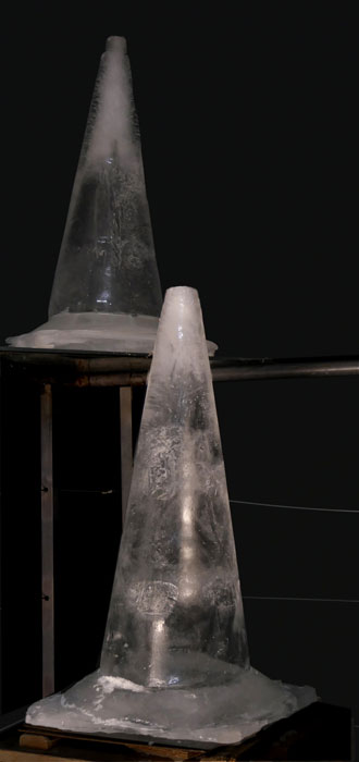 Le cône de signalisation a pour fonction de marquer un évènement, de signaler un dérangement, un obstacle, c’est sa raison d’être. C’est le contexte qui justifie sa présence. Le contexte  peut aussi aligner un certain nombre de paramètres qui rendent la réalisation d’une action possible. Le futur objet de glace devient le point de rencontre d’autres éléments qui proviennent d’autres sources, origines et fonctions.