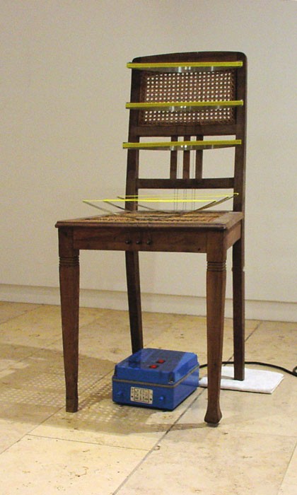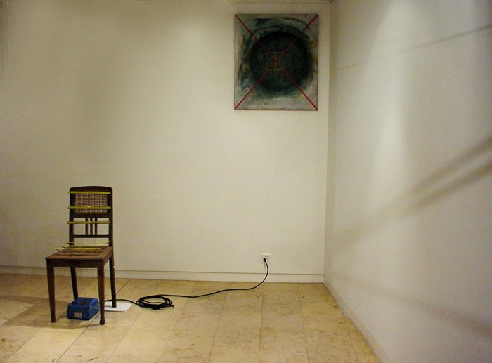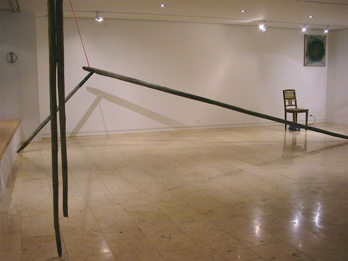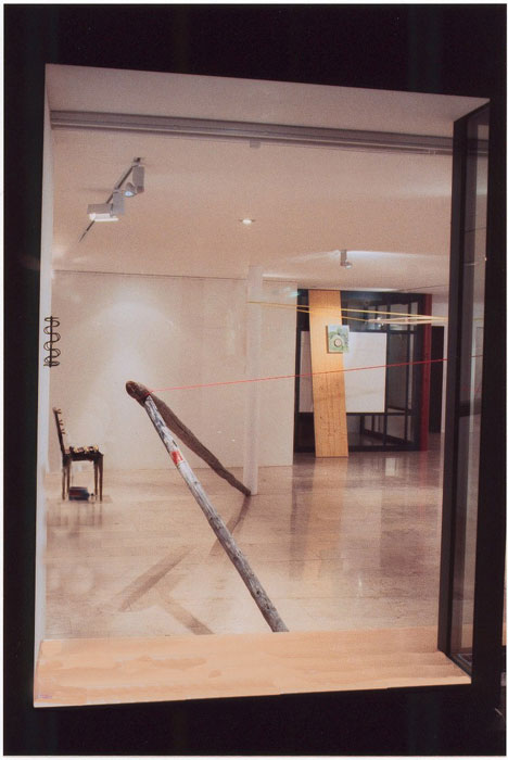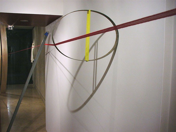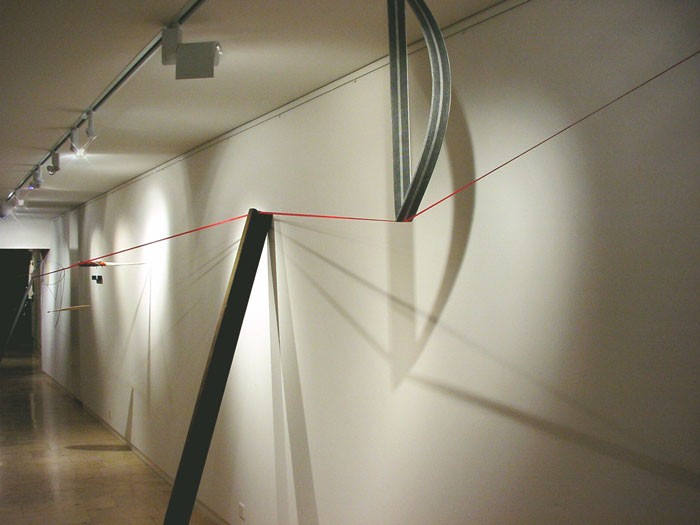 Un ruban de clôture électrique, tendu, parcourt la galerie de bout en bout.par définition, il délimite l’espace. Son tracé est jalonné d’objets divers, façonnés, trouvés.