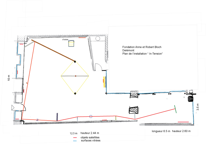 Nous, les visiteurs, en entrant dans la galerie d’exposition, nous nous retrouvons directement au cœur même de l’espace pictural et de la composition de l’artiste. Le titre annoncé de ce travail, In Tension, qu’il faut interpréter à la fois en français et en anglais, nous prépare à un saut entre l’intuition et la tension, autrement dit à une acrobatie ou à un morceau d’art, bref à un numéro d’équilibre d’une nature particulière.