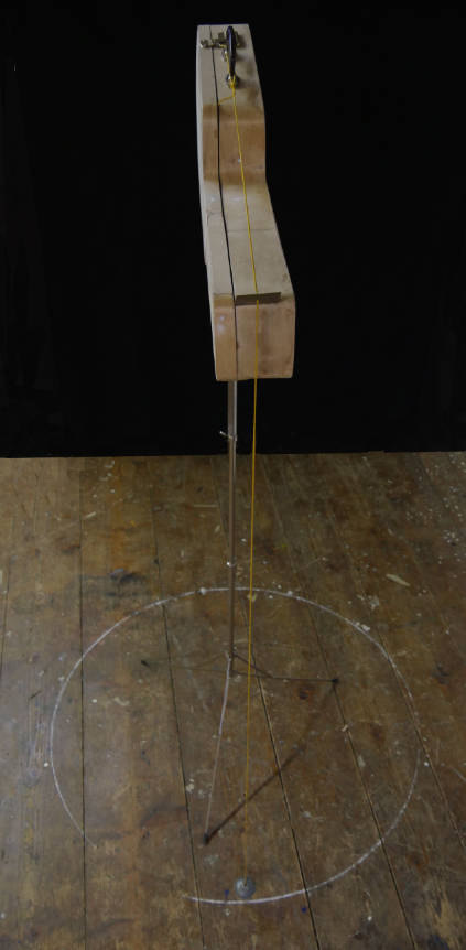 Un coffre de guitare est posé en équilibre sur un pied de lutrin. Un fil à plomb attaché à la poignée fait office de contrepoids pour en assurer l’équilibre. La pointe du poids suspendu souligne un traçage au sol à la craie qui détermine une surface circulaire comme zone d’intervention, et par conséquent un lien direct avec le lieu d’exposition.
