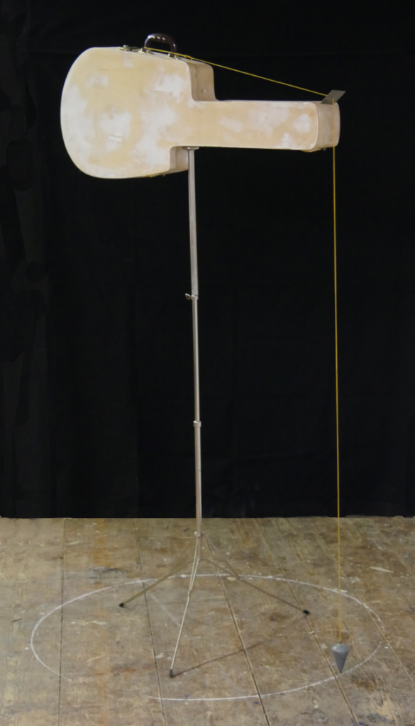 matériaux divers : coffre de guitare, pied de lutrin, fil à plomb.