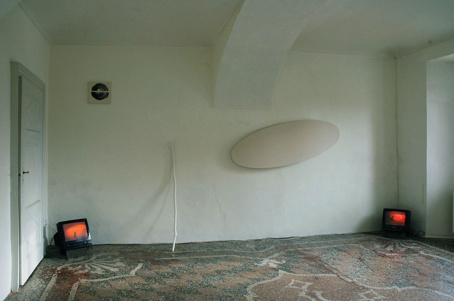 – deux toiles accrochées au mur ; l’une apprêtée, elliptique, l’autre représentant