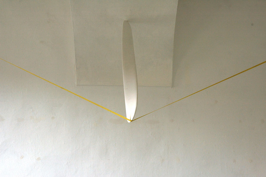 Une pièce de bois torsadée(150x10x2 cm) est maintenue en suspension sous la voûte de la galerie